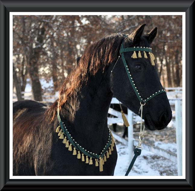 | Hand braided tack dedicated to the Friesian horse and other baroque style breeds.  Show halters, neck collars, headstalls, breastcollars, browbands, etc!  Lots of colors and styles to choose from in any size!  *Click on photo for more info  |