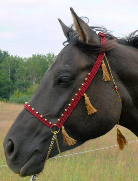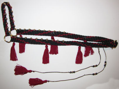 | Burgundy / Black Halter Gold beads/hardware Browband w/fringe Price: $35.00 **SOLD** Custom orders available! |