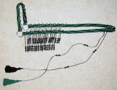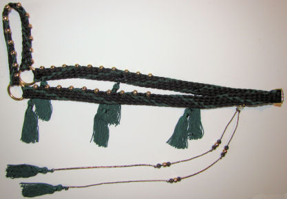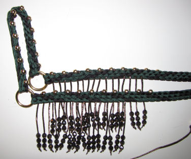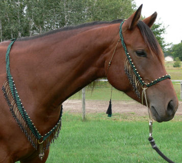 | Emerald Green / Black *Show Halter, Lead (not shown), Chin Chain, and Neck Collar Gold beads / hardware on all. Halter has fringe on cheeks and tassels at the end of the throatlatch. (Also available without the tassels on throatlatch) Collar has matching fringe. Complete Set: $90.00 |