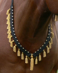 | Solid black halter Gold beads & hardware 3" gold tassels Comes with matching 7' Lead (not shown), Chin Chain, and Neck Collar Price: $100.00 |