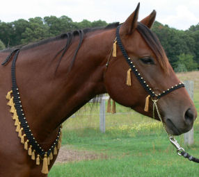 | Solid Black Halter Gold beads/hardware Browband w/fringe Price: $35.00 |