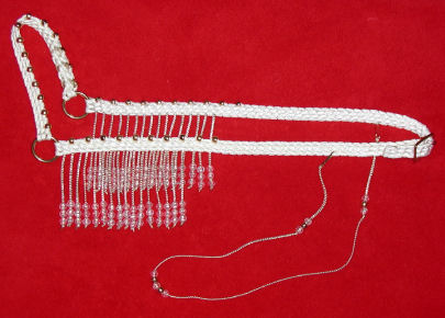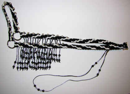 | Black / White Halter Silver beads / hardware Fringe with black/clear beads Sale Price: $28.00 Price with matching lead and chain: $50.00 |