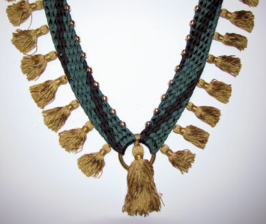 | Emerald Green / Black Neck Collar Gold beads/hardware Features (24) 2" tassels, one 4" tassel Price: $45.00 **SOLD** Custom orders available! |
