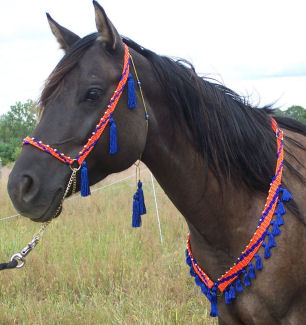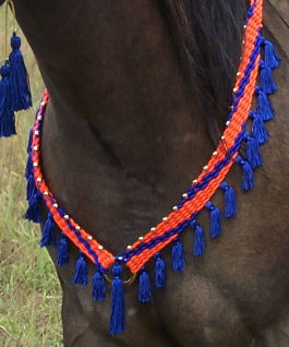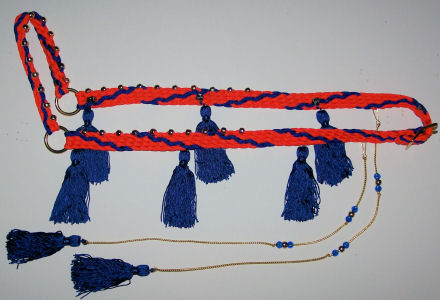 | Neon Orange / Electric Blue Halter, 7' Lead, Chin Chain, Neck Collar Gold beads / hardware on all Halter features (8) 4" blue tassels Neck Collar has (24) 2" blue tassels and one 4" center tassel This set is absolutely gorgeous! Pics do not do justice. Complete Set: $100.00 |