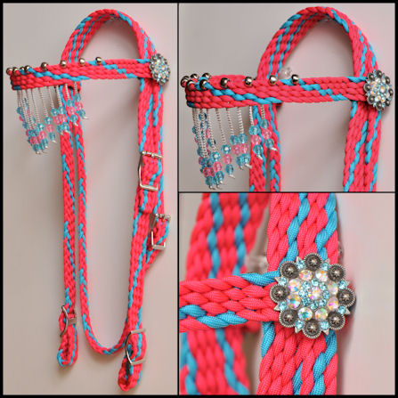 | Headstalls Braided 7/8" wide Conway buckles on bit ends Choose 1-3 colors Silver or gold beads/hardware Fringe or Tassels on the browband Price with beads and/or tassels: $45.00 Price for plain headstall: $35.00 Noseband w/beads: $30.00 Noseband without beads: $25.00 (Conchos are available in a variety of colors, and not included in the above pricing. Contact me for more info.) **More pictures coming soon** BROWBANDS ALSO AVAILABLE ALONE TO ATTACH TO YOUR EXISTING BRIDLE. SCROLL DOWN FOR MORE INFO |