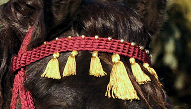 | Colors available, but not limited to: Black, white, emerald green, burgundy, red, electric royal blue, turquoise, purple, neon pink, neon orange, neon yellow, neon green, chocolate, gold, silver gray. Choose 1-3 colors ~ Nickel or Brass hardware ~ Nickel or 24kt gold plated beads ~ With or without sliding browband ~ Hanging beads or tassels on the browband or cheeks ~ Fringe on the noseband optional Comes with a matching removable throatlatch Price with beads and fringe or tassels: $50.00 Price without: $35.00 Check out the Arabian and Miniature tack pages to see some more styles and colors |