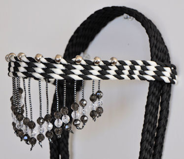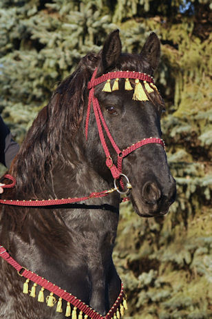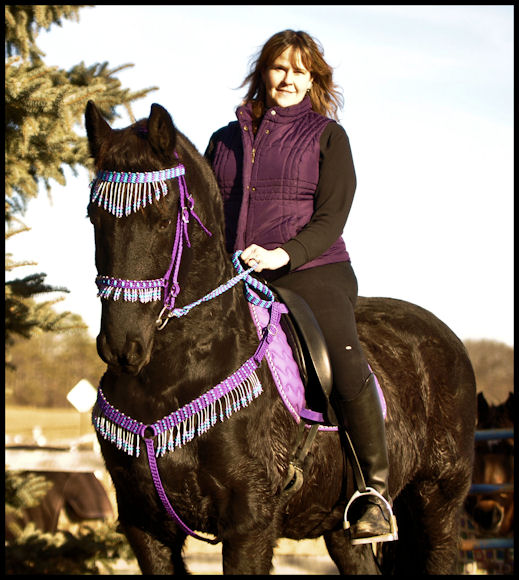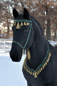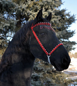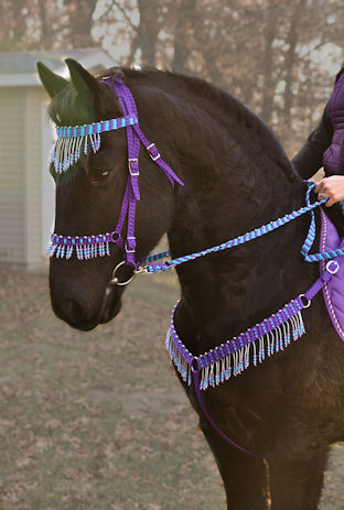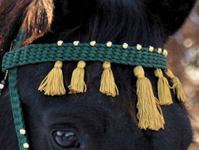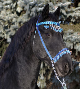 | This page is for hand braided horse tack dedicated to Friesians and other large horse breeds. (Items available in all sizes). All items are 100% hand made using durable nylon cord hand braided around nickel or brass hardware. Accented with nickel or 24kt gold plated beads. Many options available including hanging beads or tassels. There are lots of colors and styles to choose from in any size. Custom orders available. Items include: **Show Halters** **Lead Ropes** **Neck Collars** **Headstalls** **Breast Collars** **Browbands** **Reins** |