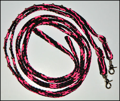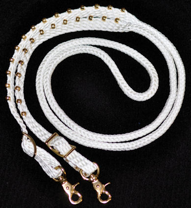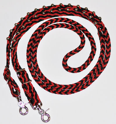| Made to match any fancy headstall Choose 1-4 colors Braided 7/8" wide 7' Single or split reins Conway buckle and trigger snap on both ends. Choose round or flat With beads - Single: $30.00 Split: $45.00 Plain Reins - Single: $22.00 Split: $35.00 |