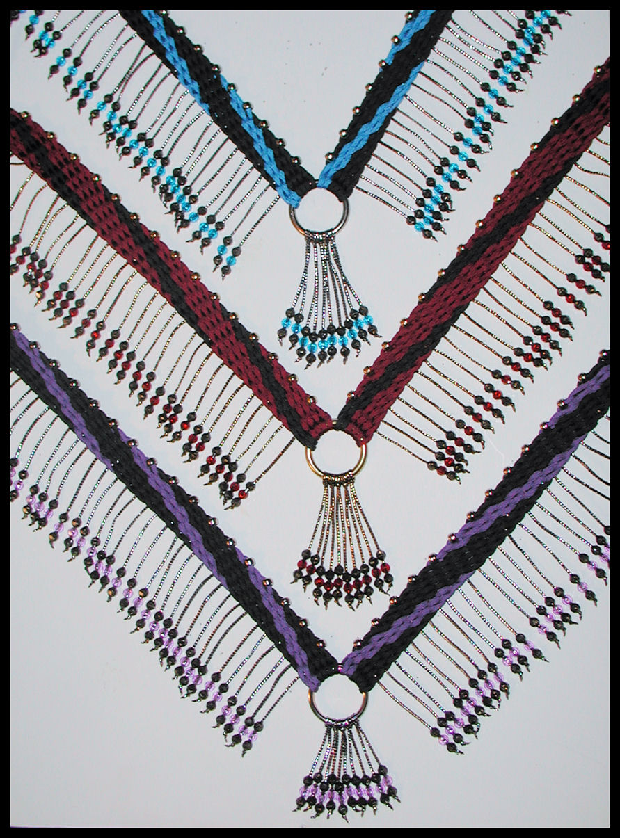 | Neck collars made with fringe and beads. Made to match any show halter! TOP: Black/Turquoise MIDDLE: Burgundy/Black BOTTOM: Black/Purple click on picture to enlarge |
